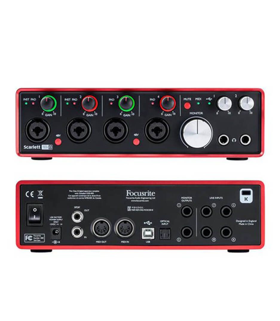 A 18i8 tem uma forma de entrada para todos, com quatro entradas de microfone/linha, sendo duas dessas combos com entrada de instrumentos, e quatro entradas de linha fixas.