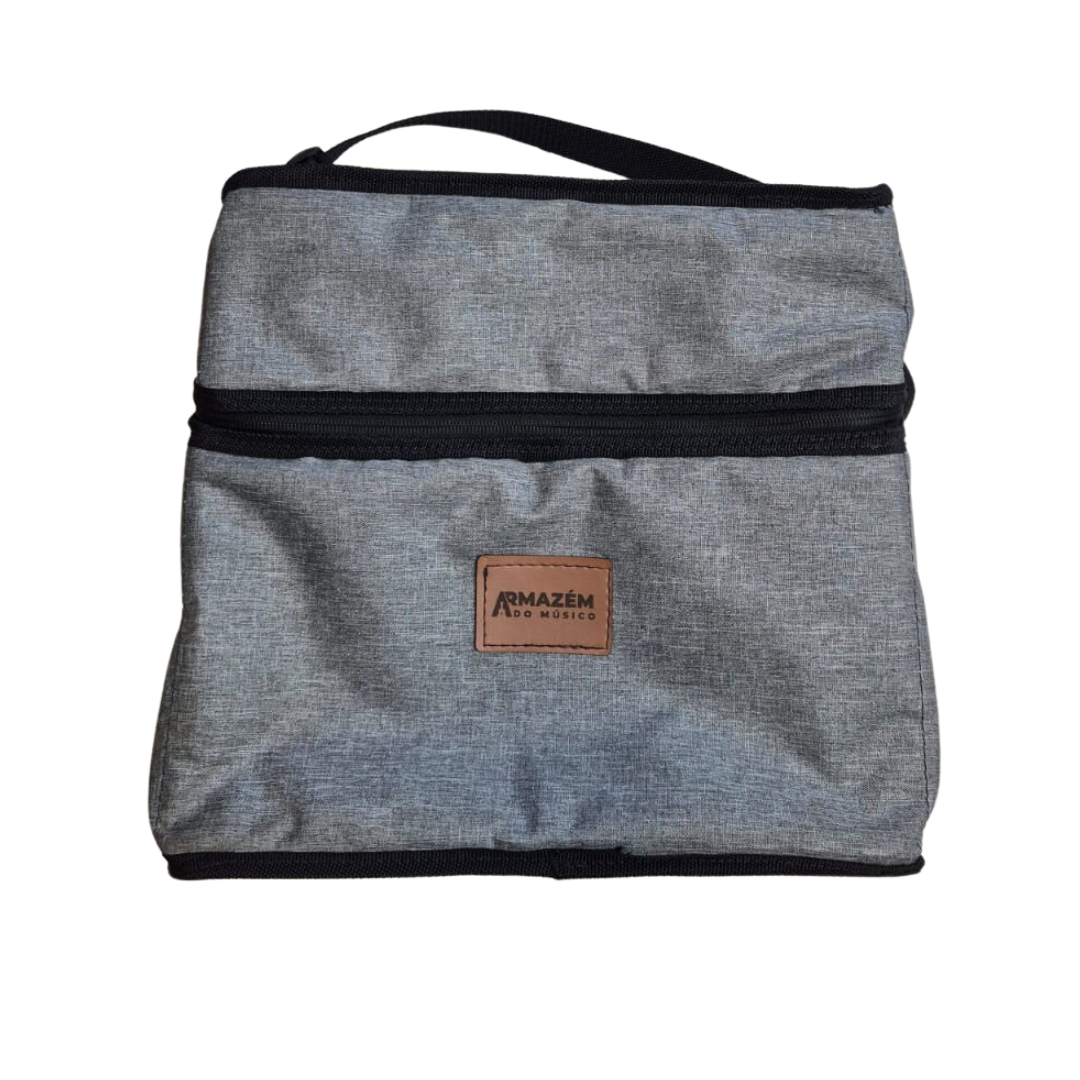O interior é acolchoado, acomodando discos de 12” com segurança e organização.